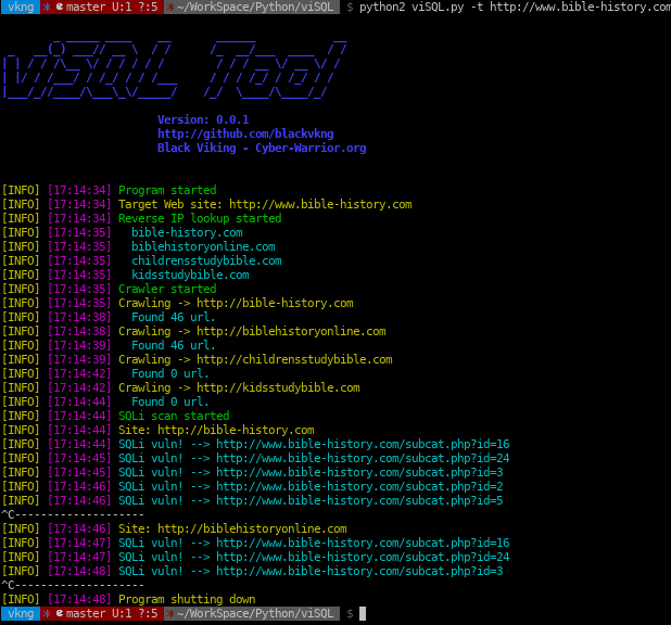 viSQL Scan SQL vulnerability on target site and sites of on server. Installation ~$ git clone https://github.com/blackvkng/viSQL.git ~$ cd viSQL ~# python2 -m pip install -r requirements.txt ~$ python2 viSQL.py --help Usage Screenshot