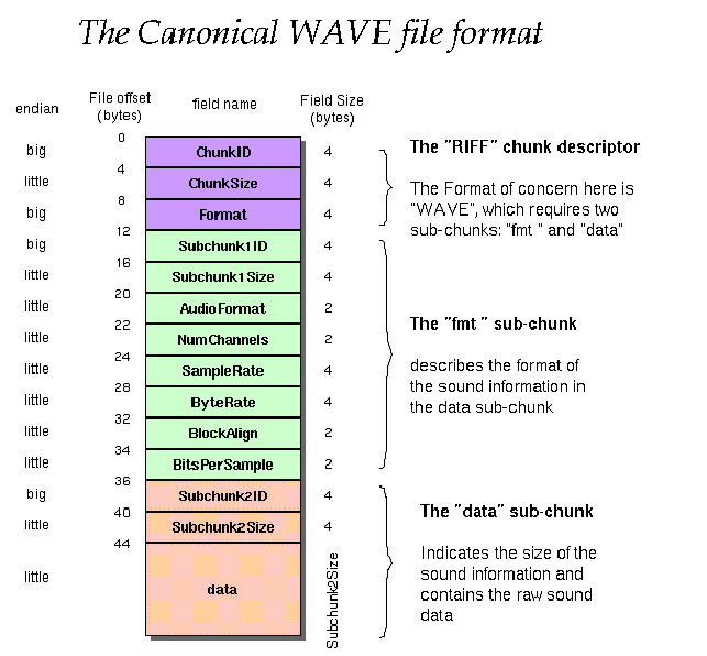 Moving to the technicals, WAVE files are stored in RIFF format which has the following structure