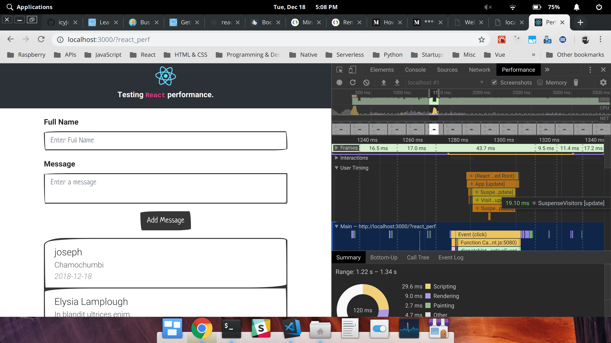 In the Chrome dev tools, we can see how long it takes to digest the event.