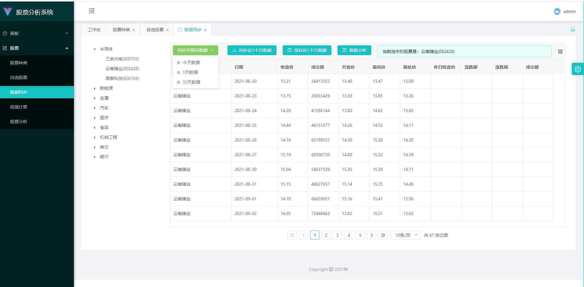 简单股票分析系统 功能 股票的登记 使用第三方接口,获取股票每天的交易信息并存储到数据库中进行分析 分析自选股票中处于低值的股票,并用不同颜色进行标识 分析选定的股票,获取各种买点的价格用于购买决策 如何获取 需要演示或者商务合作可以加微信(xpyzwm) 使用范围 作为管理系统基础模板使用 适用于毕业设计及相关产品演示 系统截图 系统首页 股票分类 添加自选股票 同步股票数据 获取处于低值的股票 股票分析